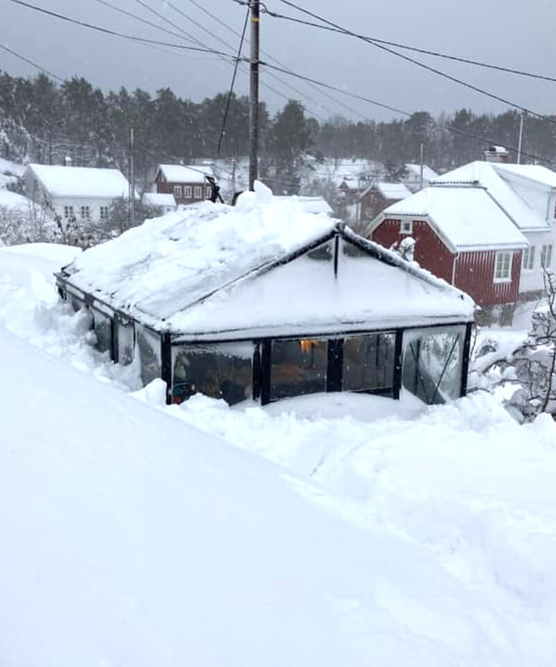 Flere av våre kunder i disse nordiske landene har rapportert om ekstreme værforhold, inkludert vindkast på opptil 35 meter i sekundet og metervis med snø. Til tross for disse utfordrende forholdene har våre drivhus og lysthus bevist sin robusthet og pålitelighet. De har ikke bare overlevd, men stått fullstendig urokkelige uten å flytte seg en millimeter.