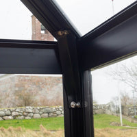 Vi har tatt i bruk en unik metode for festing av polykarbonatplater eller glass, som også brukes i industridrivhus. Platene hviler mot en kraftig T-profil, hvorpå en halvmåneprofil monteres og skrus fast. Dette sikrer en robust festing som tåler selv kraftige stormer, samtidig som det øker den samlede styrken i konstruksjonen.