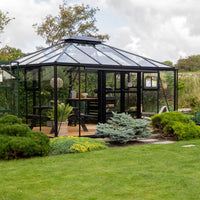 Royale Cube Plus skiller seg ut med sitt moderne utseende og valmede tak som gir et estetisk løft. Denne unike takkonstruksjonen gjør drivhuset både funksjonelt og vakkert – perfekt for å skape en lys og romslig atmosfære hvor plantene dine kan trives, og hvor du kan nyte hyggelige stunder i hagen.