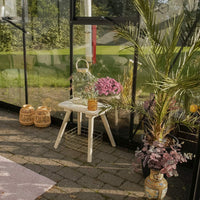 Taket består av 10 mm polykarbonatplater som isolerer og hjelper med å holde veggdrivhuset varmt om natten. Sidene er kledd med 4 mm herdet helglass, som er 4–5 ganger sterkere enn vanlig glass. Denne kombinasjonen sikrer et sikkert og beskyttet drivhus, samtidig som det gir et flott og stilrent uttrykk.