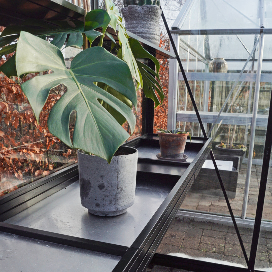 Spesialtilpasset hyllesystem til ditt Royale drivhus, Royale veggdrivhus og Royale Cube, Royale plus drivhus, Royale cube plus konstruert i ekstra kraftig sortlakkert aluminium og galvanisert stål!