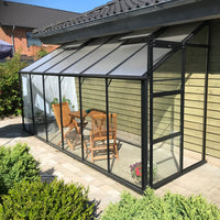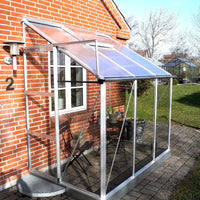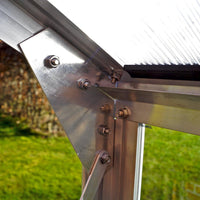 Taket er laget av 6 mm polykarbonatplater, som gir fremragende isolasjon og holder drivhuset varmt om natten. Sidene er kledd med 4 mm herdet helglass, som gir ekstra styrke og et klart, elegant utseende.