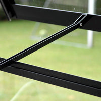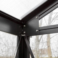 Taket består av 10 mm polykarbonatplater som isolerer og hjelper med å holde veggdrivhuset varmt om natten. Sidene er kledd med 4 mm herdet helglass, som er 4–5 ganger sterkere enn vanlig glass. Denne kombinasjonen sikrer et sikkert og beskyttet drivhus, samtidig som det gir et flott og stilrent uttrykk.