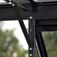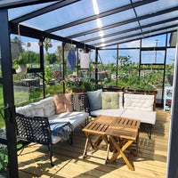 Taket består av 10 mm polykarbonatplater som isolerer og hjelper med å holde veggdrivhuset varmt om natten. Sidene er kledd med 4 mm herdet helglass, som er 4–5 ganger sterkere enn vanlig glass. Denne kombinasjonen sikrer et sikkert og beskyttet drivhus, samtidig som det gir et flott og stilrent uttrykk.