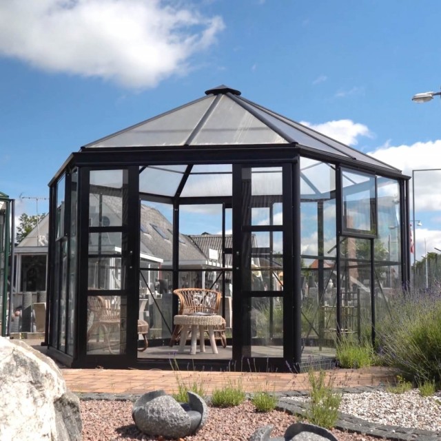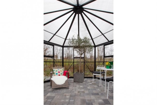 Lysthus 10 Royale leveres med 4 mm herdet sikkerhetsglass i sidene og 6 mm uknuselig polykarbonat i taket.