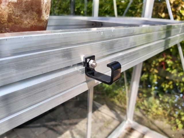 5 stk kraftige sortlakkerte opphengskroker til drivhus og hyllesystem, komplett med 5 stk skruer for ettermontering og mutter. Kan også benyttes til alle andre oppheng i drivhuset, også til tungeoppheng som ampler og tomatplanter.